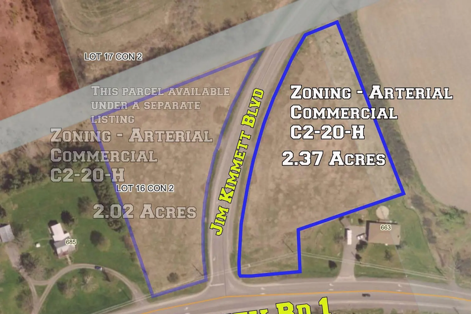 Prime location on two different roadways! This is a perfect spot to build your next business venture, the lot boasts plenty of frontage on both County road 1 and Jim Kimmett Blvd, with 2.37 acres of flat buildable land, the sky's the limit! Zoned Arterial Commercial (C2-20-H), this lot lends itself to a variety of commercial establishments and has lots of vehicle traffic! Don't miss out on this area of town, it's close to the 401, and is prime for development! Property also available for lease.