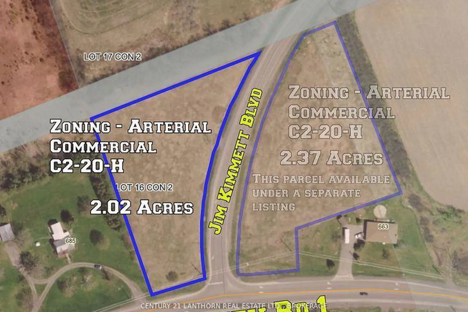 Prime location on two different roadways! This is a perfect spot to build your next business venture, the lot boasts plenty of frontage on both County Road 1 and Jim Kimmett Blvd, with 2.02 acres of flat buildable land, the sky's the limit! Zoned Arterial Commercial (C2-20-H), this lot lends itself to a variety of commercial establishments and has lots of vehicle traffic! Don't miss out on this area of town, it's close to the 401, and is prime for development! Property also available for lease.