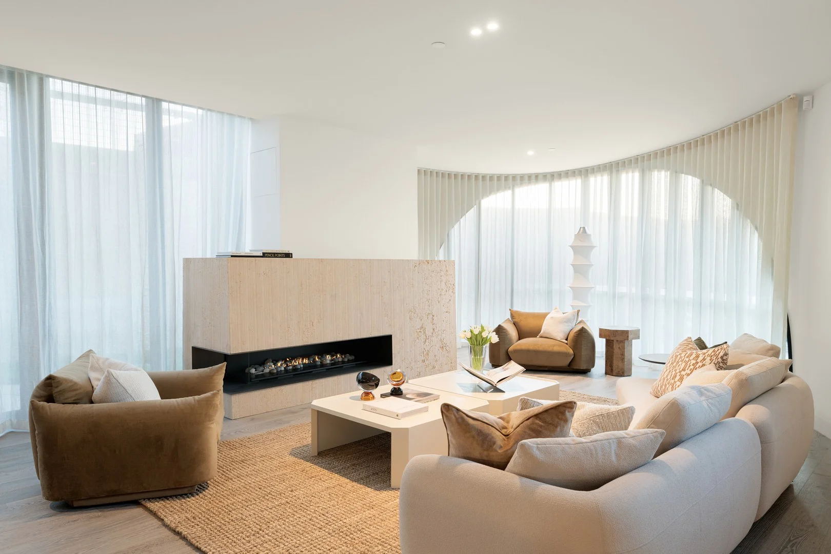 Description: Owing its allure to industry leaders Wood Marsh and SC Land, this ground-floor lifestyle sanctuary marries unmatched quality with design creativity; an expression of architectural luxe directly opposite Brighton's idyllic foreshore. One of only four in its exclusive segment, the remarkable residence hides behind thriving plant life, a security entrance, and high, stucco-rendered wall, with a welcomed setback, open spaces, and brilliant passive light key to its airy ambiance. Steel-framed circular windows shape calming floral outlooks, with long, curved walls and acoustically rated glass highlighting the home's artistic flair and considered functionality. Parting accommodation from entertaining, a wonderfully wide hallway follows the home's round form, reaching a trio of sumptuous bedrooms and pair of lavish bathrooms. A chic central bathroom services two large, light-filled guest rooms, while an elegant master ensuite boasts a standalone soaker tub and slabs of textured, floor-to-ceiling travertine. The plan's stunning focal point, entwined living and dining zones form a spectacular entertainer's suite, with a travertine-slab gas fire superb for social evenings come wintertime. Sliding Reynaers glass transforms the space into a warm-weather haven, revealing a completely private, wraparound yard primed for peaceful coffees among greenery, after-hours cocktails, and barbecues enjoying the bay breeze. An exemplary kitchen centres around a Desert Silver Marble island, complemented by tumbled travertine tiles, wire-brushed oak veneer cabinetry, a hand-finished brass rangehood, built-in bar, and home chef's selection of 400-series Gaggenau oven pair, warming drawer, fully integrated Fisher & Paykel fridge/freezer, and Gaggenau dishwasher. Its standard of specification befitting placement on Brighton's prestigious waterfront, highlights include ultra-thick double glazing, plush carpets, reverse-cycle heating/cooling, European oak floors, Vola tapware, Meridian Sculpture doorknobs, irrigation, jamb-less doors, network cables to each room, walk-in/built-in robes, under-floor heating to bathrooms, a powder room, full-size laundry, IP intercom, and private triple garage with three-phase power. A mere 20m from Green Point with the blissful bay beach beyond, it's just moments to the local baths and yacht club, Sandbelt golf courses, revered private schools, and lively Hampton, Church, and Bay Streets, with nearby Brighton Beach Station streamlining city access.