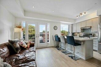 Rarely available, this 3 year old upper-level condo features an efficient layout with 3 bedrooms and 3 washrooms, high quality finishes, and a bright and inviting interior. Unique solid white oak stairs throughout. Perfect alternative to an older house or a smaller condo. The main floor has a large designer kitchen with plenty of natural light. This connects to the living room and 3rd bedroom which is perfect as a home office or dining room. The open balcony is perfect to expand the space or have a BBQ. Upstairs is the large primary bedroom with ensuite washroom, and the second bedroom with its own separate washroom. Rare and unique full size GE® ENERGY STAR® 4.1 CU. FT. Capacity Washer and GE® ENERGY STAR® 7.0 CU. FT. Capacity Dryer. One of the best features is the massive rooftop patio, complete with high-quality composite flooring, and gas line for BBQ. Very private, a perfect oasis in the city. North facing aspect, so stunning sunset views of the city from the 3 patios. Includes underground parking space and locker.