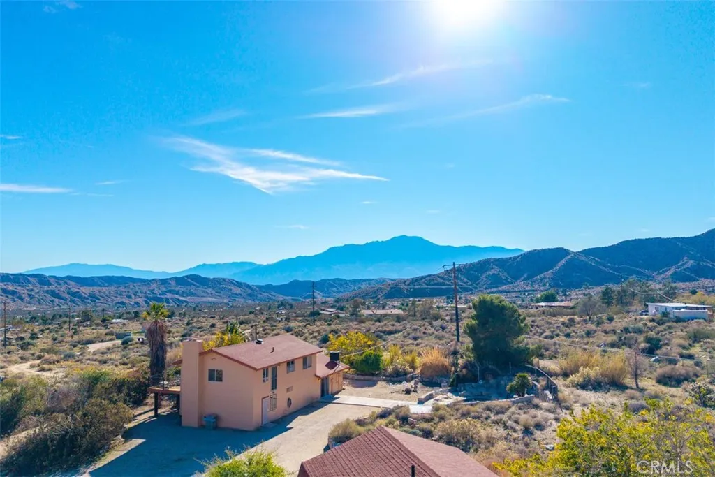 This truly is a hidden Desert Sanctuary with Sweeping Views of the valley and mountains. Welcome to your next great adventure in living - an opportunity to own a one-of-a-kind property tucked away in the serene hills of Morongo Valley. Set on 5 acres of elevated, breathtaking terrain that backs up to San Gorgonio Wilderness/BLM land, this home offers the kind of privacy, views, and potential that rarely come to market. The main residence is a two-story home, rich with character and waiting to be resurrected and reimagined into your dream desert retreat. This is more than a home - it's a life home, where every corner offers a place to "just be". The first floor features a living room with a wood-burning fireplace, a kitchen with beautiful birch cabinets and a full bath, and a bedroom. An oversized south-facing family room with a built-in bar flows seamlessly to the outdoors through a sliding glass door, leading to your private pool area - a true desert oasis. The rock waterfall cascading into the pool was thoughtfully crafted using stones from the land itself. Upstairs, the views stretch endlessly over the valley, offering a peaceful backdrop for everyday living. Another bonus feature truly sets this property apart: an oversized garage with an approximately 700 sq ft casita above. Perfect for guests, a studio, or rental potential, the casita includes a full kitchen, bedroom, bathroom, and open-concept living area - all with those same jaw-dropping views. In addition, there is a connex container for additional storage, a flex room, artist studio or ??? Horseback riding trails fan out in every direction, and hikers will find endless space to explore. Approximately 3 of the 5 acres are fenced, with a dedicated garden area and a variety of fruit-bearing and shade trees including mulberry and Texas ebony. Located about 1.5 miles off the main highway, the home offers unmatched privacy, peace, and elevation - truly a hidden treasure waiting to shine again. If you're seeking space, nature, and the chance to create something extraordinary, this property invites you to bring your vision and make it your own.