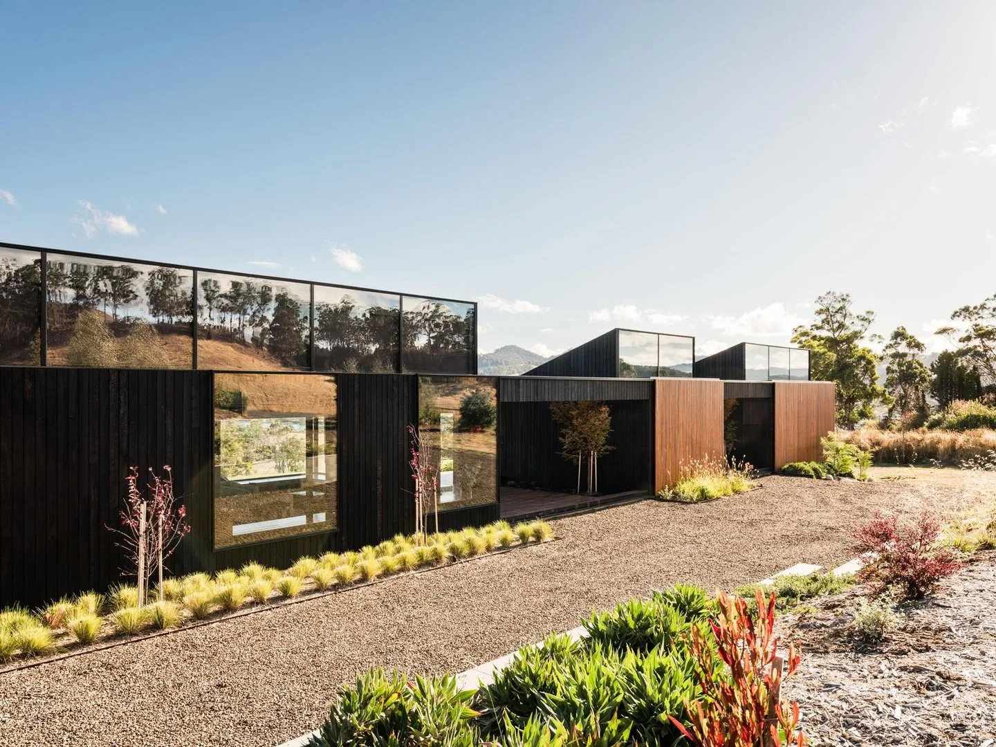 Description: Abode Suspended above rolling hills with an uninterrupted outlook across Port Cygnet, this architect-designed pavilion residence is a striking expression of contemporary design in harmony with its landscape. Elevated, private and beautifully resolved, the home captures expansive views and ever-changing light, creating a sense of calm that feels both immersive and refined. Designed by acclaimed architect Nathan Crump and crafted by Overland Builders, the residence is composed as a series of interconnected pavilions, each deliberately positioned to maximise outlook, privacy and connection to the natural surroundings. The exterior is clad in shou sugi ban spotted gum, lending depth, texture and understated drama, while native gardens soften the architecture and enhance the retreat-like atmosphere. The main living pavilion unfolds beneath soaring ceilings, where walls of glass frame sweeping vistas across the bay and surrounding countryside. Polished concrete floors, a wood heater and warm timber detailing establish a grounded yet sophisticated interior, complemented by mid-century influences evident in the internal and external brick fireplaces. The kitchen sits confidently at the heart of the home, pairing dark cabinetry with rich timber accents to anchor the open-plan living and dining space. Comfort is seamlessly integrated throughout, with hydronic underfloor heating across the living zones and a remotely controlled automated garden watering system, ideal for owners who travel or seek a low-maintenance lifestyle. The master suite is thoughtfully positioned to capture the morning light and commanding views over Port Cygnet. Its ensuite is a serene retreat, featuring a deep soaking bath framed by sky and landscape. A covered walkway leads to the second pavilion, offering a private guest suite with its own ensuite and elevated outlook. Sliding screens wrap the courtyard spaces, allowing each outdoor area to be tailored for light, shelter, privacy or breeze. The third pavilion adds exceptional flexibility, functioning as a self-contained living space or alternative luxury master suite. With an open-plan bedroom and living area, kitchenette, timber flooring, wood heater and panoramic bay views, it is ideal for guests or multi-generational living. The bathroom is a standout, featuring dual rain showers beneath a skylight, creating the rare pleasure of showering beneath the stars. The pavilion layout has also enabled the home to operate successfully as a high-end short-stay accommodation, with separation, privacy and architectural appeal combining to offer an attractive lifestyle and income opportunity. Area Set within the Huon Valley's celebrated fruit-growing region and moments from two award-winning wineries, the property enjoys peaceful seclusion with everyday convenience. The cafés, shops and school of Cygnet township are just three kilometres away, while Hobart's CBD is easily reached in under fifty minutes. A home of exceptional design integrity and craftsmanship, this is an elevated sanctuary where architecture, landscape and location come together with rare clarity.