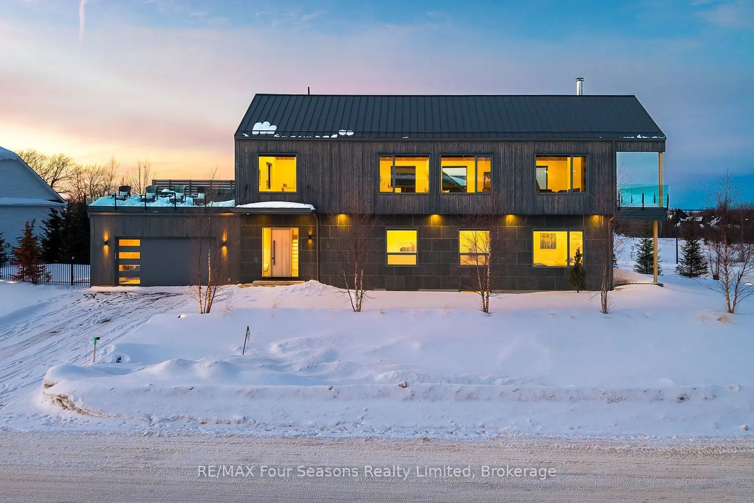 A striking contemporary ski chalet set in the heart of Nipissing Ridge, offering stunning, unobstructed views of the ski hills and Georgian Bay from the great room and multiple decks. Designed and built by Higher Ground Building Corp., this thoughtfully crafted 5-bedroom, 4-bath custom home is made for après-ski gatherings and relaxed mountain living, seamlessly blending modern architecture with classic chalet warmth. The open-concept upper level is designed for entertaining, featuring a showpiece custom kitchen with a dramatic 10-ft quartz island, walk-in pantry ,wet bar, and walk-out to a generous 23' x 23' deck. The great room is anchored by a STÛV wood-burning fireplace and soaring cathedral ceilings clad in vertical Ontario white cedar. Two walk-outs lead to a covered deck and hot tub-perfect for soaking in the hill views by day and the glow of the slopes by night. The main-floor primary suite offers wall-to-wall closet space and a spa-inspired 5-piece ensuite, alongside main-floor laundry and two additional bedrooms, all with heated floors for year-round comfort. The fully finished lower level features polished, radiant in-floor heated concrete throughout, a spacious family and media room ideal for post-ski movie nights, and two additional bedrooms-perfect for family and guests. Located just minutes from Craigleith and Alpine Ski Clubs, Northwinds Beach, Blue Mountain Village, dining, and shopping, this is a rare opportunity to enjoy a true four-season chalet lifestyle in one of the area's most sought-after neighborhoods.