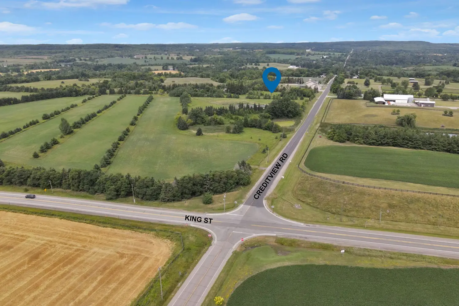Located near the highly sought-after Cheltenham Village in Caledon, this impressive 70.5-acre property features a charming 2-bedroom home along with three existing outbuildings, including a three-section driving shed (24' x 36', 12' x 72', and 40' x 20'). Ideally positioned at the corner of King Road and Creditview Road, the property is surrounded by custom-built multi-million-dollar estate homes, private farms, and picturesque equestrian facilities. This exceptional location offers the perfect setting to build your dream estate, providing both privacy and a prestigious rural lifestyle. Convenience is unparalleled-just 10 minutes to Brampton and 20 minutes to Orangeville, with easy access to Highways 410 and 401. The area is rich with local amenities such as a public school and the scenic Forks of the Credit Conservation Area. Year-round recreation abounds, from tranquil walks along the beautiful Caledon Trail to championship golf at Osprey Valley Golf Club, host of the RBC Canadian Open, and the renowned Devil's Pulpit Golf Course. Winter enthusiasts will appreciate the world-class skiing, snowboarding, programs, and terrain park at the Caledon Ski Club. Buyers and agents are encouraged to perform their own due diligence. Additional features include a 100-amp electrical panel, wireless internet, drilled well, septic system, and the availability of town water hook-up near the property line.