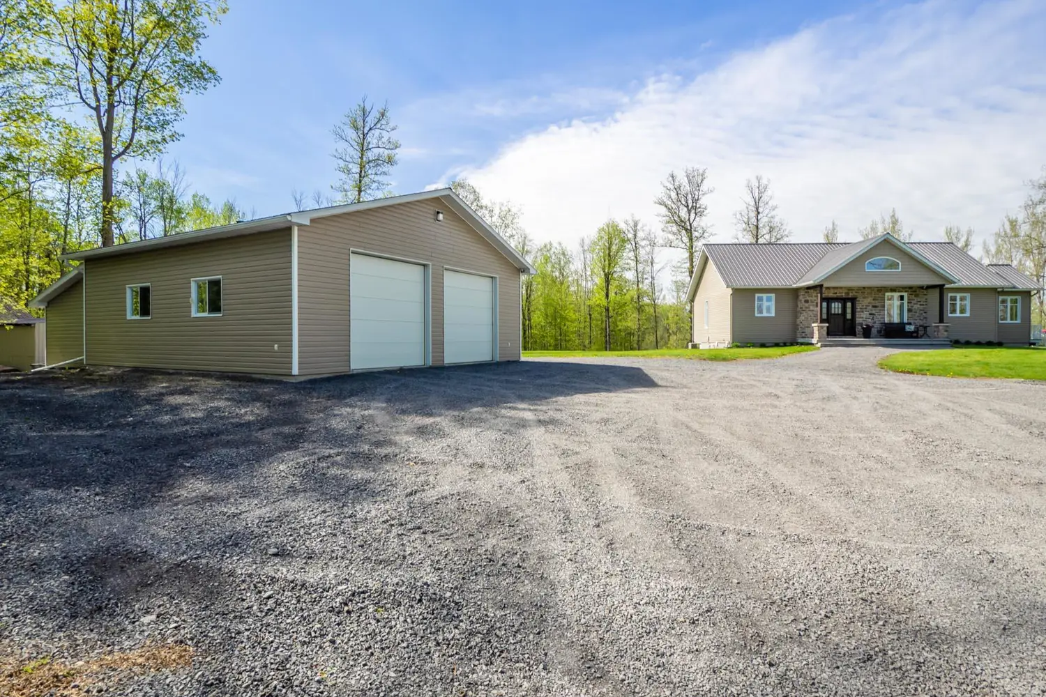 Apple Hill ! Nestled on a sprawling 66-acre private, treed lot, this stunny property offers the ultimate tranquility. Bungalow built in 2011 > Lovely & unique home radiates warmth and charm, exceptional window size. Insulated Concrete Form (Nadura Foundatation). Main floor features large open and bright kitchen with plenty of cupboard space and a dining room, living room with fireplace and 2 bedrooms. The basement is finished and features in floor radiant heat as well as a wood stove. Large recreation as well as a full bathroom, utility and cold room. The exterior features a metal roof with stone and vinyl siding. The property is bisected by the Beaudette River and features multiples bridges on site for safe crossing. Further to the south of the home there is a isolated hunting camp 24x20 which is heated by a wood stove and features, kitchen /living room area, a bedroom and a washroom. Hunters paradise !Detached Garage 20x24, Isolated Shop 30x30 with 8 garage doors with a wood burning stove, 2 Gazebos, Shed, a shelter for the trailer 24x14 and a man made pond +- 75x150 Country Living with land for nature walks, hunting, snowmobile and 4 wheeling. Flooring : Ceramic and Hardwood