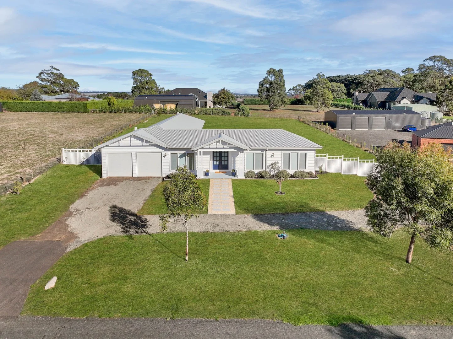 Description: Exuding timeless elegance and designer finesse, this exquisite five-bedroom, three-bathroom residence by "Jackson Dwellings" showcases peerless craftsmanship and luxury across 2,998m² (approx.), just minutes from the centre of Kyneton. A gorgeous weatherboard façade with decorative gables and white picket fencing set a sophisticated tone, while inside, soaring ceilings, and bespoke lighting choices are just a few of the many impressive architectural elements throughout, with bleached timber flooring and gold accents enhancing the home's warm, contemporary aesthetic. Designed to embrace natural light and deliver tranquil garden views from every room, the home gravitates from a frontage lounge to a breathtaking kitchen featuring a dedicated island, white herringbone-tiled splashback, navy cabinetry, gold tapware, a 900mm-wide oven with 5-zone cooktop, and a dishwasher-supported by a large butler's-style walk-in pantry. Dining and living zones unfold beneath a stunning pitch-raised ceiling, with glass sliding doors opening to the lawned garden and peaceful rural outlooks beyond. The intelligent L-shaped layout creates two private accommodation wings, with the main wing hosting three bedrooms including a sublime primary suite with a walk-in robe and opulent ensuite showcasing twin raised-bowl vanities, a niched frameless-glass shower, and signature gold finishes. A central bathroom with a shower and thick-rimmed oval bath serves the two additional bedrooms. Behind a barn door, the northern wing offers two further bedrooms with built-in robes, a study, and another beautifully finished bathroom. Comprehensively appointed with an integrated remote-controlled double garage, zoned ducted heating/cooling, double glazing, an internal laundry, 2,020L water tank, and gated side access, this luxury home is less than an hour from Melbourne and 40 minutes from Bendigo, and a short drive to schools, cafés, V-Line station and Kyneton's vibrant township including Piper Street hatted restaurants and bars.