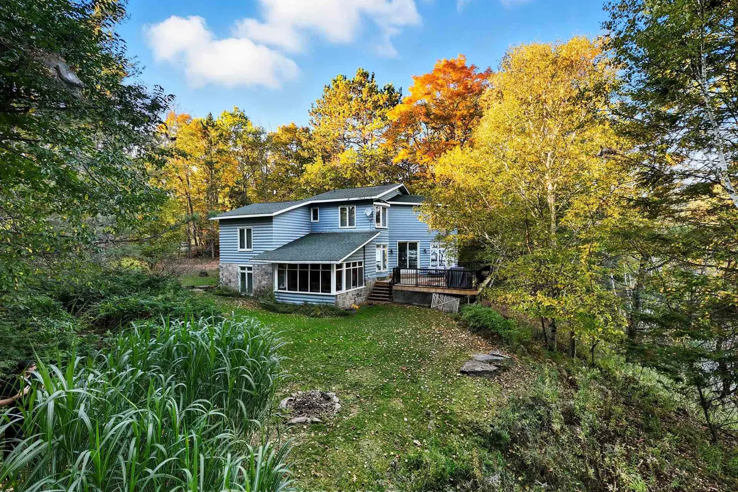 Nestled on scenic Mary Lake in Huntsville's coveted Chain of Four Lakes, this fully winterized waterfront retreat offers 330 ft of shoreline and 1.3+ acres of gently sloping & level, southeast-facing land with spectacular sunrises. The spacious 4+1 bdr & 3 bath home boasts an open-concept main level w/a large eat-in kitchen, dining and family room & walkout to a new private deck with unobstructed lake views. Primary bdr features a 4-pc Ensuite and serene lake vistas, while additional bedrooms provide plenty of space for family and guests. Enjoy a cozy sunroom, firepit area, two bunkies (one for sleeping, one for storage), and a premium dock system for effortless lake access. With 40+ miles of navigable waterways, this property is perfect for boating, swimming, and fishing. Complete with a Huntsville Short-Term Rental Accommodation (STRA) license, this rare offering blends privacy, comfort, and natural beauty ideal for year-round living or investment.