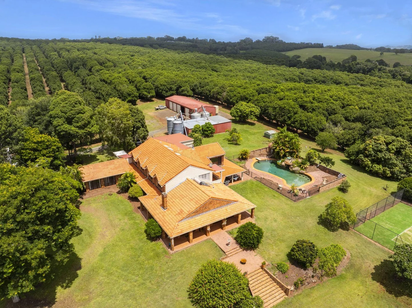 Description: Welcome to this superb macadamia estate boasting a beautifully tree-lined driveway leading to your private oasis. Sprawling across 47.52 hectares (117 acres) on two titles. With an estimated 9,500 established trees, a high tonnage yield, and a good mix of varieties with spacings of up to 10 x 5. This two-level residence has been transformed through extensive internal renovations, featuring modern upgrades and refreshed interiors for enhanced comfort and style. The kitchen is a standout, featuring porcelain tiles, beautiful granite benchtops, and stainless steel appliances, providing an abundance of storage and workbench space, ideal for daily living and entertainment purposes. The home offers expansive living areas, including a formal lounge and dining area with an open fireplace, office, and music room. Showcasing high ceilings, magnificent exposed wooden beams, timber doors and windows, and abundant natural light pouring through extensive glass doors, the space creates a natural, inviting atmosphere. It presents a separate bathroom with a wheelchair-friendly shower, providing easy access and optimal comfort. The primary bedroom offers generous spaces, featuring a spacious walk-in-robe and an ensuite with large exterior doors that open onto a private balcony, offering a peaceful retreat with scenic views. Including a freestanding spa, walk-in glass shower, and high-end fixtures, it adds a touch of sophistication. The three extra bedrooms are bathed in natural light, offering a balance of openness and privacy, with large glass windows and adjustable blinds to tailor the space to your preferences. Along with a private timber-lined library/sitting room, it features polished floors and large picture windows overlooking the picturesque gardens and orchard. Enhanced by a separate family room that seamlessly flows out to a spacious outdoor entertaining area overlooking a beautifully landscaped in-ground pool with a stunning feature waterfall and diving board, accompanied by a full-sized tennis court and a dedicated croquet ground. Creating the perfect environment for year-round enjoyment. * 7-bay machinery shed for all your operational needs. * Multiple storage silos ensure ample storage space for harvested products. * Dedicated dehusking shed designed for seamless processing. * Licensed bore. * Two spring-fed dams set within parkland. * Additional flat featuring an open-plan design, with a spacious dining room, bathroom, and functional kitchen. * All necessary equipment to work the farm is included in the sale. Exclusively Listed by Century 21 Alstonville. Contact Noel Outerbridge on (02) 6628 7122 to arrange a private Inspection!