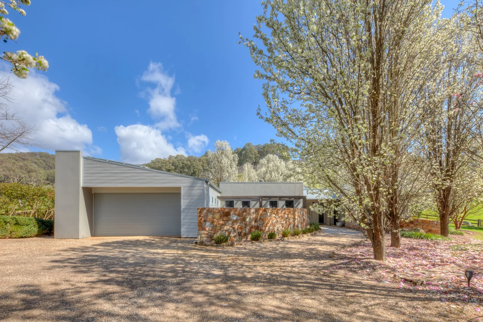 Description: Architecturally designed with a focus on solar passive principles and sustainable living, this exceptional craftsman-built home exemplifies quality, comfort, and energy efficiency. Set on a rising 16-acre parcel of land, featuring a blend of cleared fertile land and natural bush, this contemporary gem boasts four spacious bedrooms and two luxurious bathrooms, while being framed by stunning northerly aspects and an outlook in every direction. The residence features a thoughtful combination of materials, including polished concrete floors, stainless steel, recycled timber, local stone, and rendered double brick, with a striking choice of finishes throughout. The impressive entrance leads you to a grand double-door foyer and formal reception area, before transitioning into the expansive open-plan living space that is bathed in natural light and winter sunshine. A chef's kitchen, equipped with Miele and Smeg appliances, offers abundant bench space, storage, and a walk in pantry. The central dual-sided slow combustion fireplace elegantly separates the dining and lounge areas, high ceilings and large glass windows create a bright & airy atmosphere whilst this space effortlessly connects with your undercover outdoor entertaining space. The master suite offers a breathtaking outlook, a generous fully fitted walk-through robe, and an ensuite with Italian limestone tiles, a freestanding Apaiser bathtub, and a spacious walk-in shower. Three additional Queen-sized bedrooms, premium fixtures, double-glazed windows and pure wool carpets, further elevate this home's appeal. Sustainability is at the forefront, with its Northern orientation, rooftop solar panels feeding back in to the grid, evacuated tube solar hot water, and zoned hydronic floor heating throughout the home. Storage is in abundance inside and out, with the large double garage & above-ground cellar, huge storage and machinery sheds with ample workshop space, your own built-in cool room, and open bays for more wood storage, van or carports, or anything else that needs undercover protection. There is also a deep bore, 4 rainwater tanks with 110,000 litre combined capacity, fenced vegetable garden, a variety of fruit and nut trees, including citrus, pears, walnuts and chestnuts, dwarf orchard, fenced secure paddocks for stock or pets, fully landscaped grounds featuring more stunning local stonework, and all sitting just across the road from the Ovens River. A true lifestyle property of an exceptionally high quality, that is sure to impress.