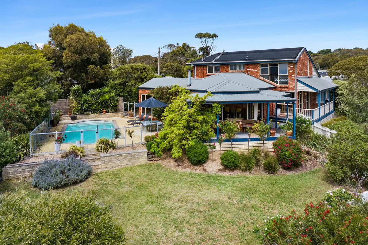 Description: Tucked just one street back from Jan Juc's Ocean Boulevard and the iconic Bells Beach walking track is a magnificent two storey 3-bedroom home exuding character, charm, and coastal living at its finest. From the moment you lay eyes on this distinctive property you'll be captivated by its unique features and the promise of a relaxed, beachside lifestyle. The house is set on an expansive 1170m2 (approx.) allotment and in 2 titles (599m2 & 571m2), offering a sense of tranquility, privacy and views to the north over the Jan Juc township. A beautiful balcony graces the front of the house, providing a perfect spot to enjoy a morning or afternoon cuppa, the properties large backyard is a lush green oasis and provides plenty of space for outdoor activities. It also highlights an in-ground swimming pool favouring a northern orientation perfect for cooling off on hot summer days, the pool area is a true entertainers paradise or offers a serene and private escape. Once done for the day you can wash of in the separate shower room with toilet, easily located in the laundry room. The house features three spacious living areas, each with its unique character. One of these living spaces stands out with a feature brick wall, adding rustic charm to the interior. A wood-burning fireplace in this area ensures a cozy atmosphere during colder coastal nights. The other living areas are open, bright, and welcoming, comprising the second living room with ambient wood fire and open plan kitchen and dining. All three bedrooms on the second floor are spacious, have built in robes and offer serene retreats with views of the surrounding greenery, the family bathroom on this level is a standout feature boasting a stylish blackwood twin vanity adding a touch of elegance and freestanding bath. A landing at the top of the stairs provides a study nook area complete with window allowing that natural light to stream through. The home has a beautiful timber floorboards, slate tiles, and carpet, plantation shutters, a reverse cycle air conditioner in the main living, ceiling fan, under stair storage, garden shed, side access to park your caravan and boat, a single car garage and plenty of off-street parking. This truly is a rare opportunity to secure a fantastic property in a great location, on a huge allotment in 2 titles and with loads potential. Call us today for further information.