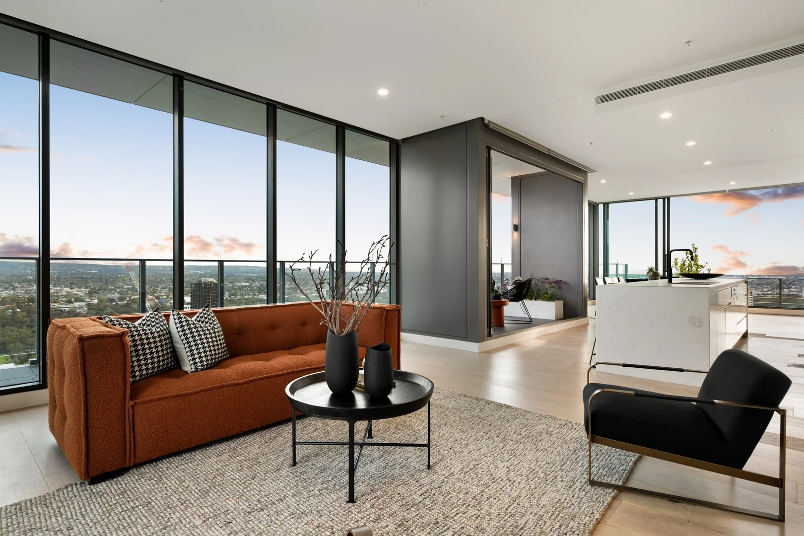 Description: Commanding an elevated position atop the 30th floor of the famed Kodo Complex, offering stunning and irreplaceable views of Adelaide's rolling Hills, dynamic cityscape and aquamarine foreshore, is this incredibly well located, intelligently designed and luxuriously appointed Penthouse offering the utmost in convenience and luxurious living without compromise. Featuring 3 generously sized bedrooms, ample indoor and alfresco living areas, 2.5 luxe bathrooms and 2 large ground floor car parks, the Penthouse is awash in natural light, spacious and airy. Complementing the grandeur and feeling of space is the bespoke fit-out, completed to the highest of international standards. Entering via a private lift lobby shared with only one other apartment, one is ushered into the expansive Penthouse that effortlessly opens into an immense open plan living, kitchen and dining area with towering ceilings framed by floor-to-ceiling double glazed commercial grade windows. The chef's kitchen, featuring minimalist, ultra-luxurious finishes and copious high-quality cabinetry, stainless-steel Miele appliances and a grand marble benchtop is enough to satisfy even the most demanding of gourmands (with further storage provided by a Butler's Pantry). The self-contained Master Suite (with fitted WIR and capacious fully tiled master bath), and two additional bedrooms (both with BIRs), enjoy access to the vast wrap-around terrace and outdoor alfresco area complete with in-built BBQ, bar fridge and sink facilities, ideal for sky high entertaining. Further Features Include: - Home Automation for blinds, entertainment systems, lighting, ceiling fans and air-conditioning/heating - Intercom access - Bi-fold stacker doors idyllic for indoor/outdoor entertaining - Built in entertainment unit with hidden cocktail bar - Oversized fridge alcove - Plush carpeting & ceiling fans in bedrooms - Large stand-alone bathtub in central bathroom & heated towel rails - Separate powder room - Automated irrigation systems to garden beds - Access to communal lawned entertaining areas on level 5 Ideally located, the Penthouse is adjacent to Victoria Square and is within close proximity to the Adelaide Central Market, the university precinct, Rundle Mall, Chinatown, The Adelaide Oval and is a short walk to public transport, Adelaide High School and an array of private schools. Representing a true home in the sky, 3002/29 Angas Street assures one's position among Adelaide's elevated elite.