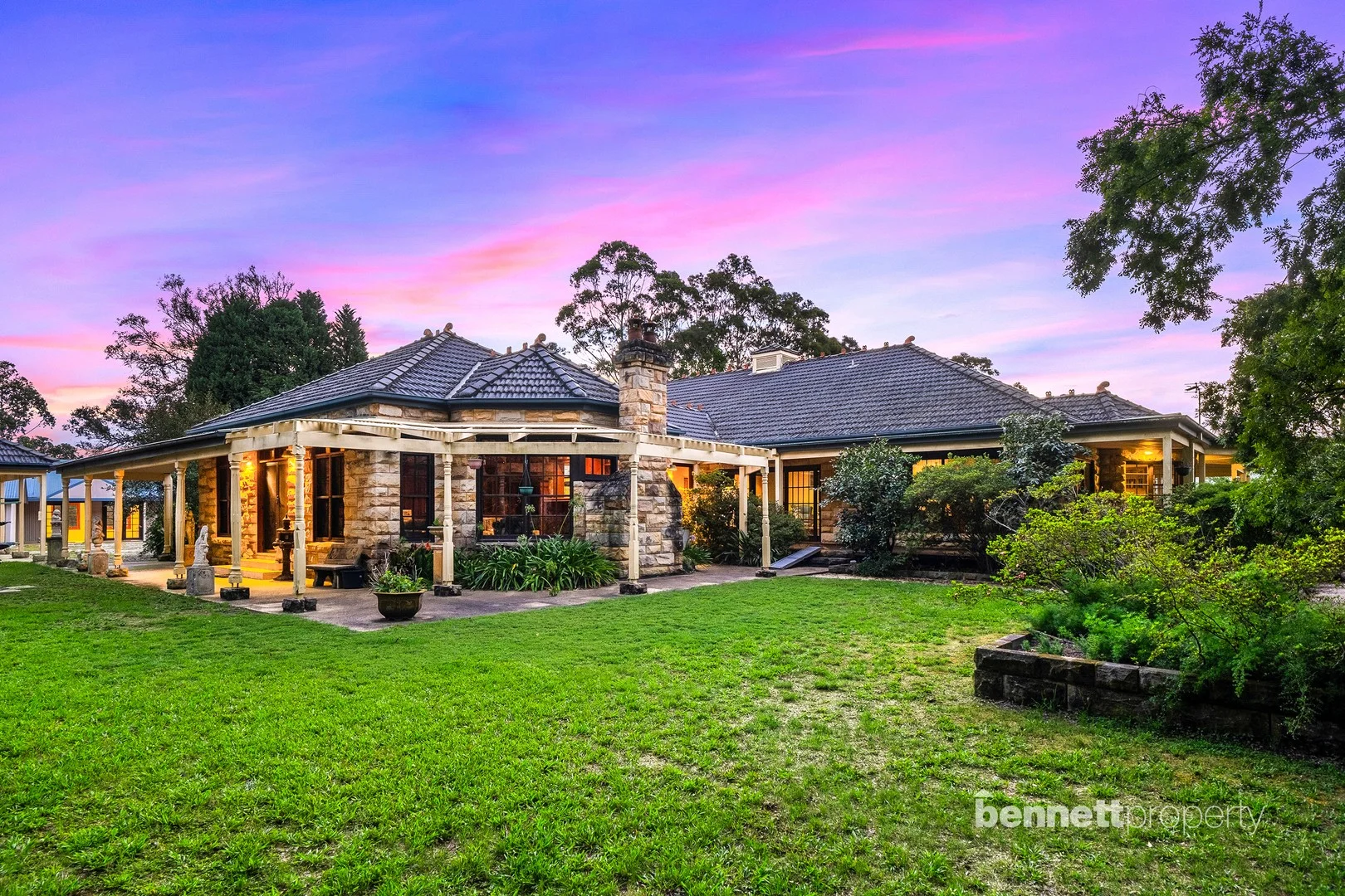 Description: Welcome to peace and serenity at the prestigious residence of Overton Lodge, where a luxurious lifestyle awaits. Offering an expansive sandstone and tile residence with a terra-cotta roof. This four-bedroom home has a separate two-bedroom cottage and is situated on approximately 10 acres. The property is in an exclusive pocket of Kurrajong, perched on an elevated hilltop, surrounded by glorious mountain views and breathtaking tree-top outlooks. The stand-out aspect of this property is that you're completely private and tucked away neatly from the street. Fitted with electric security gates and tar-sealed driveway, enveloped by a tranquil treescape of breathtaking tall established trees and a beautiful large dam with Lily Pads and a pump. The grand homestead occupies a commanding position on the land and combines Mediterranean style with colonial design. Wide front entrance doors welcome you into the expansive rumpus room, which can be utilised for several purposes and offers a fantastic entertaining floor plan with a large fireplace, dance floor, and bar. More like a ballroom than a large rumpus! The home is designed to allow abundant natural light to filter in and features a substantial layout, including a spacious office/study with a lovely bay window. Cooking will be a joy with ample room to move, plenty of cabinet space, quality appliances, a walk-in pantry, and a large island bench. The kitchen overlooks an abundant living space, and there is also a formal dining room and a lounge. The master bedroom wing includes a walk-through his-and-hers closet with lighting and a relaxing ensuite with a spa bath. The home has ducted air-conditioning in most rooms and a split system in the main bedroom. The other three bedrooms each have built-in wardrobes and are located near the main bathroom. There is also another toilet and powder room - perfect for guests. The swimming pool is perfectly positioned and is an eye-catching feature of the residence. Easy access from the main home straight onto the pool patio, with Georgian columns presenting a gorgeous resort-style pool atmosphere with vast mountain views. This area would be perfect for large gatherings and features enjoyable entertainment by the poolside. Outside is a magical haven of meticulously maintained garden beds and scenery, with numerous sunny spots to sit and relax. There is an additional separate two-bedroom cottage/studio on the property. Having spacious living areas with air conditioning and downlights. Main bathroom with a two-way design to service both bedrooms. Both bedrooms have built-ins, and there is also a single lock-up garage plus workshop space. An excellent addition for large extended families or guest accommodation. For additional parking, there is an undercover 3-car carport, plus ample room in the courtyard and around the grounds. So if you're a family that needs their space, loves entertaining, demands privacy and insists on luxurious finishes as well as plenty of usable land, then this property may very well be the one for you! Inspections are by appointment. For further information or to arrange a viewing of this beautiful acreage property, please call our expert team at Bennett Property today.