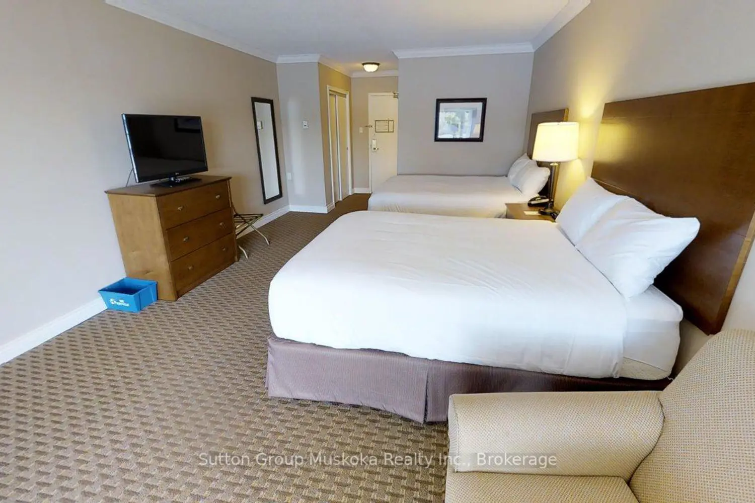 DEERHURST RESORT - BAYSHORE COMPLEX LOOKING OVER PENINSULA LAKE - Top floor waterfront condominium located in the Bayshore complex at Muskoka's premier resort - Deerhurst Resort. This waterfront unit offers a great view over Peninsula Lake and is steps away from the beach. Inside the unit, you will find a large great room with two queen beds, a sitting area, flat-screen TV, a bar fridge, and a full bathroom. The unit is on the rental program with the resort providing revenue to the unit owner. The monthly condo fee is $563.30 plus HST and the annual property tax of $1597. Enjoy the resort lifestyle - golf, beach, pools, tennis, trails, restaurants, and more. HST is applicable to the sale of this unit and is recoverable. The unit is a large hotel room, all Bayshore units must be kept on the rental program with the resort. Great unit - Great location and an amazing resort! Revenue paid to unit owner for 2024 was $15,053. Revenue for 2025 not including December 2025 was $14,818 (December revenue to follow). Enjoy the resort lifestyle! Live, vacation and invest in Canada!