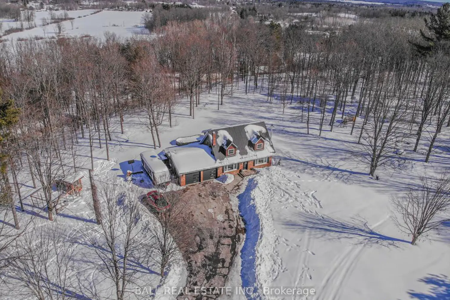 Beautiful two-storey brick country home set on just over 5 private acres in a scenic hilltop setting, only minutes from Madoc. Paved driveway leads to a 29' x 25' heated double garage with epoxy flooring and inside entry. The main level features California engineered hardwood floors, an updated kitchen with granite countertops and dishwasher, formal dining room with patio doors to a screened covered outdoor space, living room, and a cozy sitting room with propane fireplace. Upstairs offers 3 bedrooms including a primary with walk-in closet and a 5-piece bath with soaker tub, walk-in shower, and double vanity. The lower level includes a gym area, ample storage, airtight wood stove, propane furnace, utility room, and walk-up to the garage. Steel roof, updated windows, brick and Hardie board siding complete this well-maintained country property offering privacy and convenience close to town.