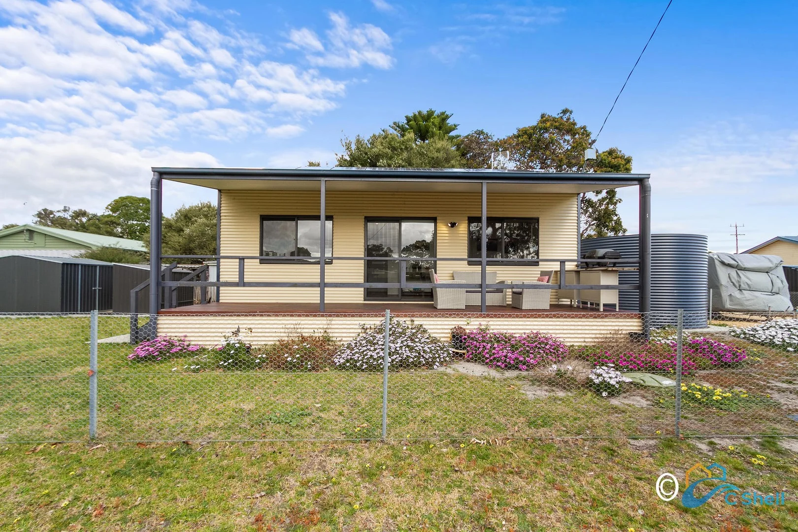 Description: Positioned just moments from Lake Victoria and a short drive to the iconic 90 Mile Beach, this beautifully presented two-bedroom home is the perfect coastal escape, permanent residence, or smart investment. Built in 2021, the home boasts a durable steel frame and Colorbond exterior for long-term, low-maintenance living. The north-facing undercover deck welcomes you in, leading to a light-filled open plan living space with a modern kitchen featuring elegant neutral finishes and the bonus of a dishwasher! Stay comfortable year-round with a reverse cycle air conditioner, while the thoughtfully designed floorplan places both bedrooms just off the main living area. Additional features include a compact European laundry, a modern bathroom, and the convenience of being sold furnished ideal for holidaymakers or interstate buyers looking for a move-in-ready option. Outside, the home sits on a fully fenced corner block, offering a greater sense of space. There's plenty of room for storage with a double garage and two garden sheds, while solar panels on the roof help keep energy costs low. Enjoy the best of coastal living with Lake Victoria at the end of the street, and local shops and eateries just a short stroll or quick drive away. Whether you're seeking a relaxing holiday home or a permanent sea change, this stylish, modern home ticks all the boxes. Inspect today this one won't last long! * * * * * * * CShell Real Estate does not warrant, guarantee or make any representations regarding the currency, accuracy, correctness, reliability, usability or any other aspect, of the material presented on the CShell Real Estate Website and it is recommended that prospective purchasers and users of the website make their own enquiries and seek independent legal advice in relation to the subject property. All drone image measurements are approximate and not to exact measurement.