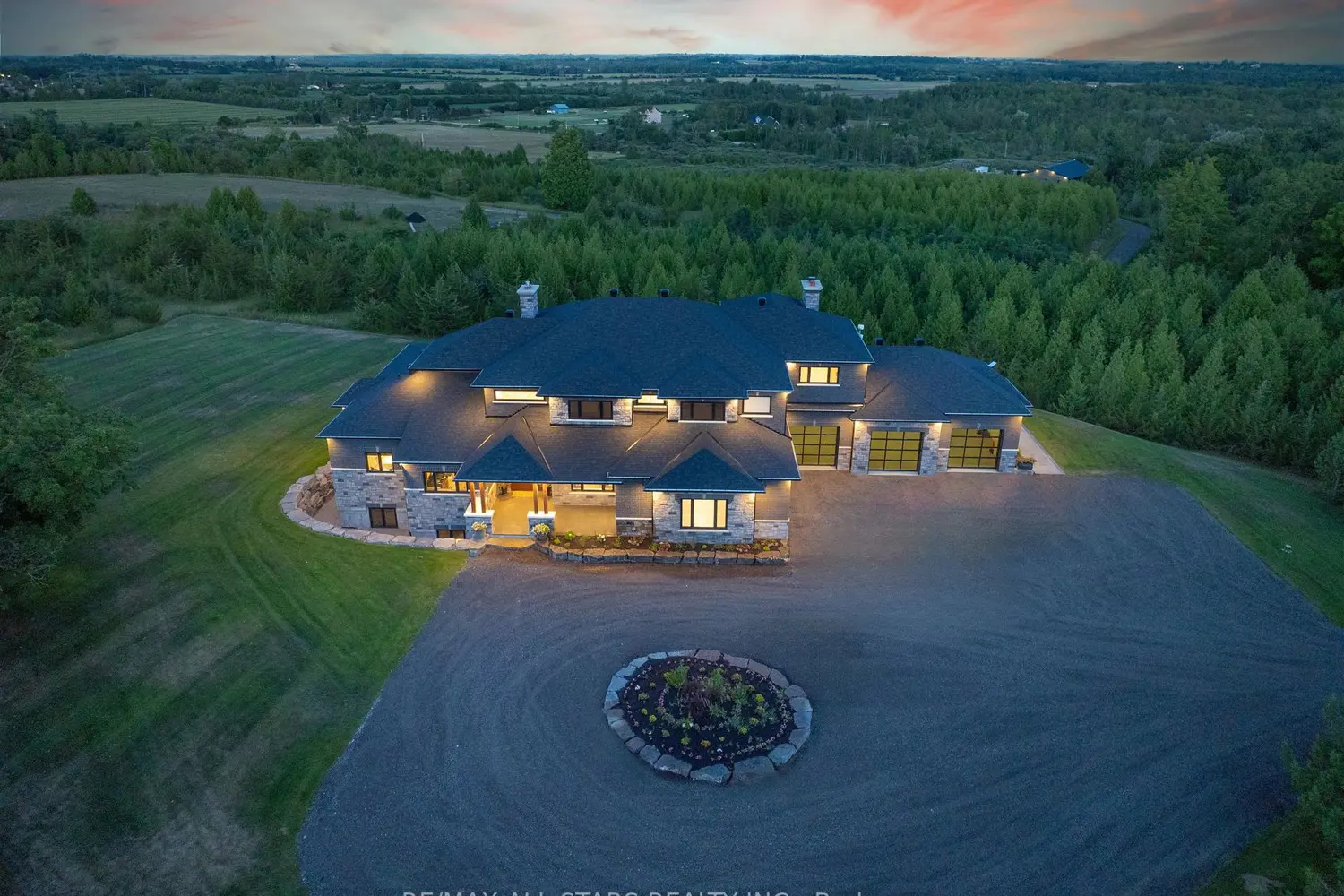 Welcome to this extraordinary custom-built luxury estate, a private hilltop retreat set on 36 acres of rolling countryside with breathtaking panoramic vistas. Offering 12,500 sq. ft. of exceptional living space, the home impresses from the moment you step inside. The great room boasts 20 ft soaring ceilings, a dramatic wood-burning fireplace, and a custom stone chimney. The gourmet chefs kitchen is a showpiece, featuring built-in Thermador appliances, an expansive gas range, beam ceilings, two oversized islands, and a seamless flow into the open-concept dining room, which walks out to a patio with an outdoor wood-burning fireplace. This rare property offers 8 spacious bedrooms, 8 bathrooms, including a main-floor primary suite with an indulgent 7-pc ensuite, heated floors, soaker tub, double rain shower, and a couples walk-through closet. Built with quality ICF construction, it showcases custom millwork and stonework throughout. Additional highlights include a 5-bay, 2500 sq. ft. attached garage w basement access, elevator, rough-in for a spa, large soundproof theatre room, and a rec room with walkout to the rear patio. The grounds blend natural beauty with functionality: mature trees, farmable acreage, landscaped gardens, and a private pond with dock, firepit, and a charming outbuilding. Completing the property is a fully operational 5,000 sq. ft. workshop with office space, and including a 4,000 sq. ft. in-law suite ideal for multigenerational living, a home-based business, or the passionate hobbyist. This is luxury living without compromise. Property Tax have not been assessed.