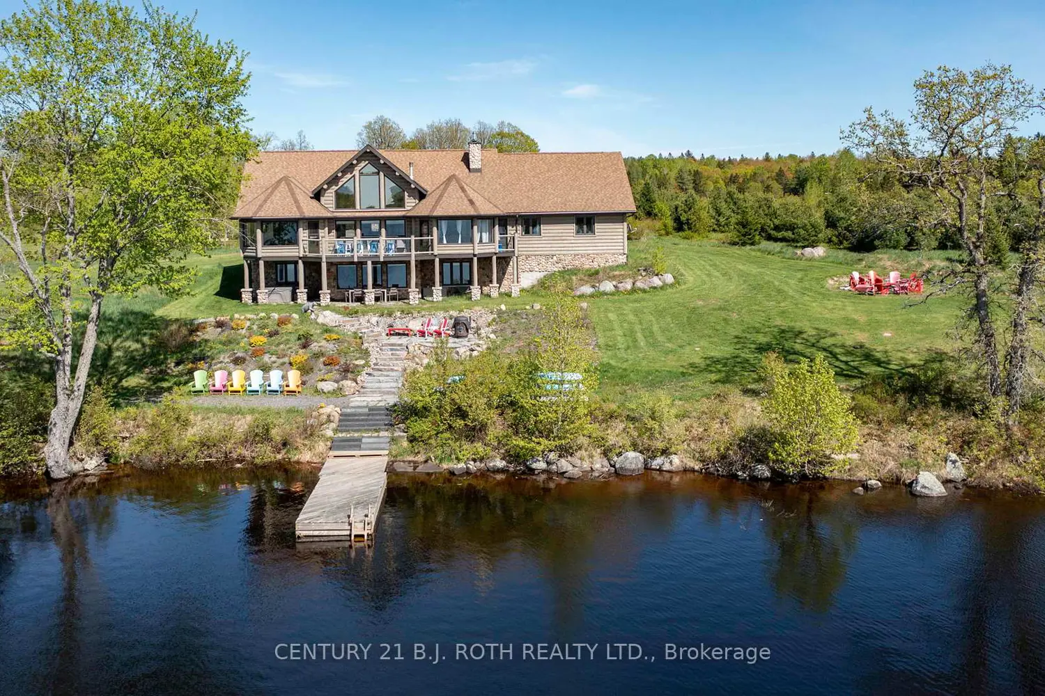 An exceptional west-facing waterfront estate on Lake Manitouwabing, set on nearly 5 acres with 521 feet of pristine shoreline and stunning sunset views across a quiet, sheltered bay. Positioned well away from boat traffic and road noise, the property offers outstanding privacy with direct access to one of the area's most desirable lakes.The residence features 3+2 bedrooms and three elegant bathrooms, including a spacious 27' x 15' waterfront primary suite with spa-inspired amenities such as a double shower and soaking tub. The open-concept living space showcases vaulted wood ceilings, hand-scraped flooring, and striking floor-to-ceiling stone fireplaces.A chef's kitchen with high-end stainless-steel appliances is ideal for entertaining. Outdoor highlights include a granite waterfront patio, fire pit, deep-water dock for swimming and boating, and a relaxing hot tub. A substantial 2,000 sq. ft. detached garage/workshop provides excellent storage and versatility.