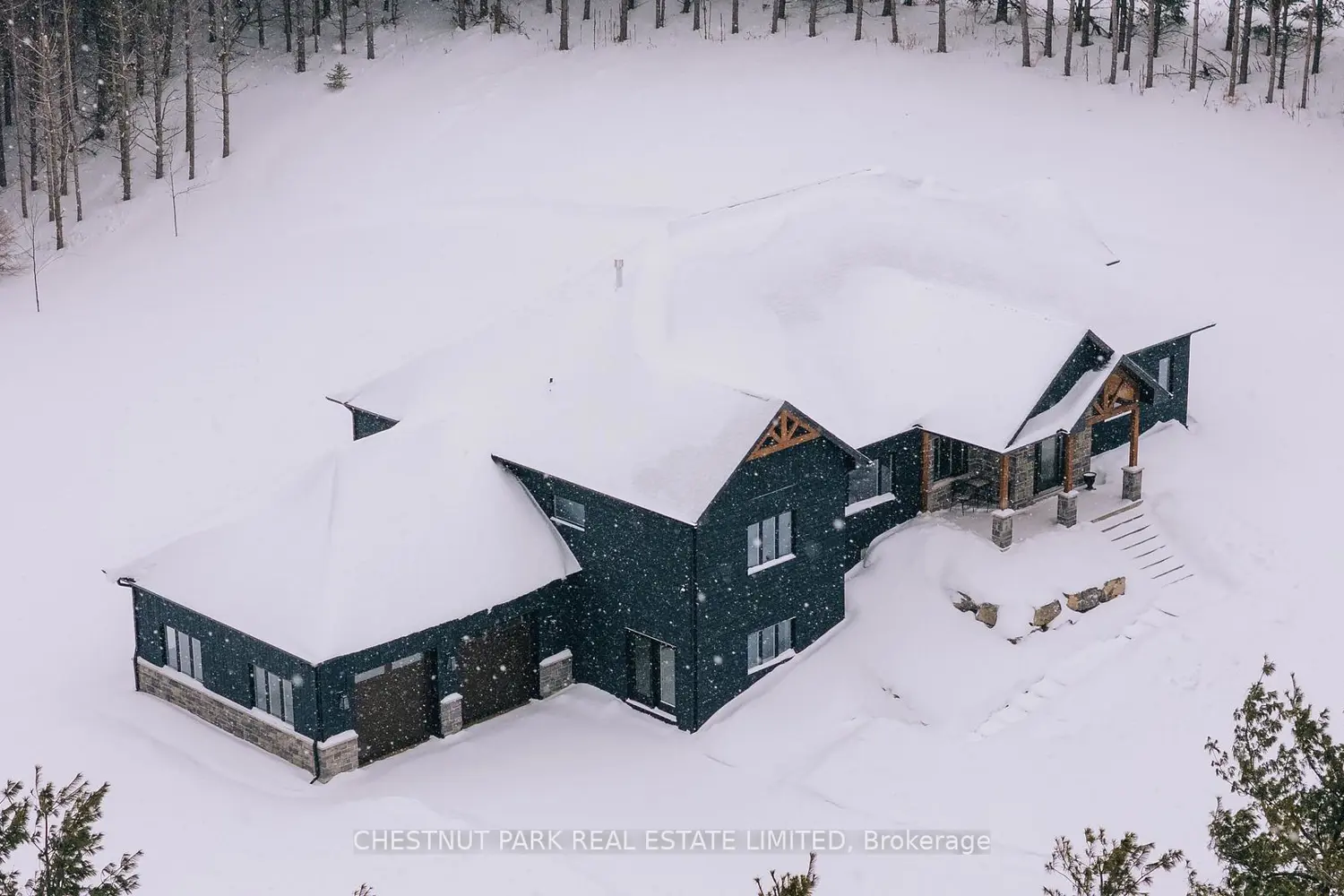 Nestled among pine trees on 24 private acres in Mono Township, this newly completed custom home offers 4,800 square feet of thoughtfully designed living space on two floors. The main level features an open concept layout with stunning vistas from every window, a chef's kitchen with top-of-the-line appliances and walk-in pantry, wide plank white oak flooring, and a vaulted timber frame ceiling anchored by a showpiece fireplace. The primary bedroom includes a walk-out to a covered patio, large walk-in closet, and a spa-like five-piece ensuite. Three additional light-filled, generously-sized bedrooms complete the main floor, along with a spacious laundry room. The walk-out basement features polished concrete floors with radiant heat and a flexible layout ideal for recreation, games, home gym, or other uses, plus an additional bedroom with ensuite. The attached 2 car garage has radiant heated floors perfect for car storage or workshop needs. Set back from the road with a long private drive, the property offers woodland trails with abundant wildlife, providing peace and privacy just 15 minutes from Orangeville. Set in the north part of Mono Township this property enjoys amenities in both Mono and Mulmur including easy access to Mansfield Ski Club, Hockley Valley Resort, The Bruce Trail, Mono Cliffs Provincial Park, Sheldon Creek, Maple Grove Farm and other local amenities. A wonderful opportunity to buy a never been lived in home!