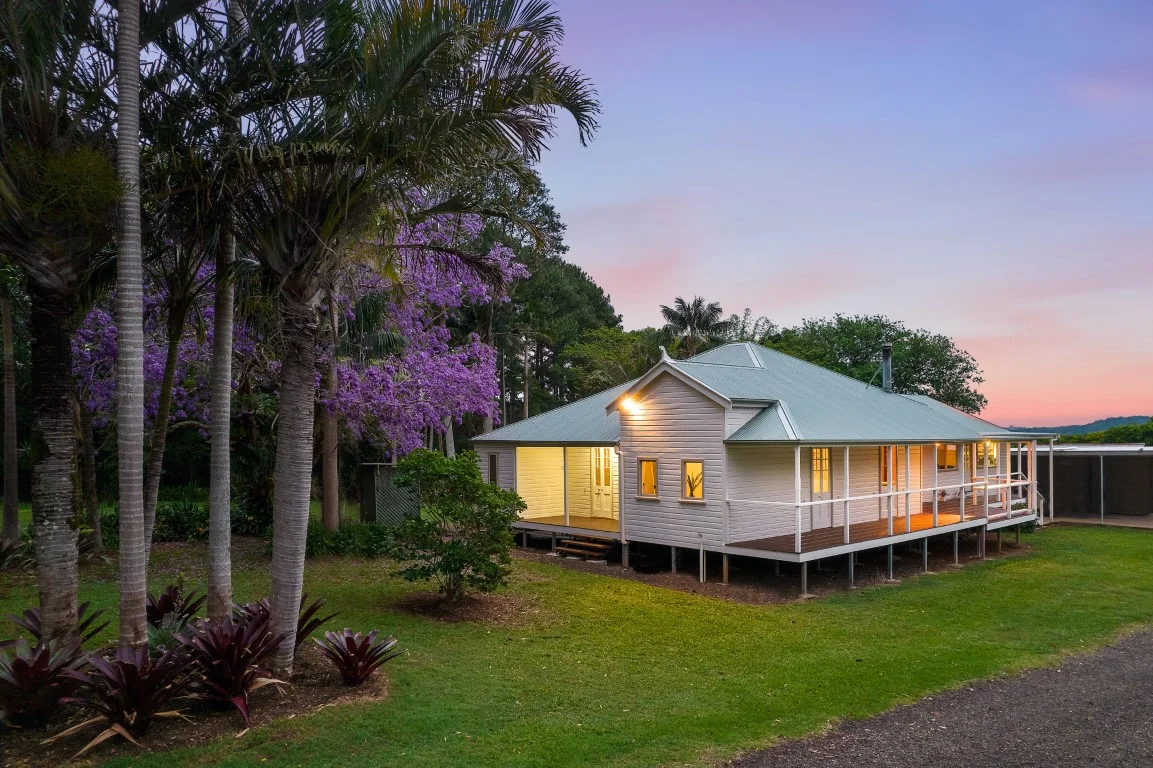 Description: Gently sloping prime agricultural pastureland, a truly inspiring property the ultimate in hinterland lifestyle. Ideal to set up your perfect high end equestrian centre or just enjoy this rural retreat. Magnificent tree-lined driveway makes a grand entry to this stunning property nestled into Federal ridgeline, a much sort after Byron hinterland location. Gorgeous almost 100 year old beautifully renovated federation homestead with all the charm of yester-year and the convenience of todays modern living. Featuring classic rich polished timber floors, timber lined walls and elevated ceilings. Central kitchen hub, timber and stone tops, s/s gas stove and walk-in pantry Either side dual dining areas formal and casual or flexible living space, Separate cosy living room with combustion woodfire, leading out to the verandah Main bedroom with built-ins and annex room ideal as dressing room or nursery. Two further spacious cool bedrooms and large office or 4th single bedroom Two bathrooms featuring freeform timber vanity tops, claw foot bath and bespoke shower room, a little bit of luxury and a lot of class. Full length north aspect verandah the perfect entertainer, fire up the BBQ and dine alfresco raising your glass to the stunning setting sun, a riotous display of colour as it sets below the distant Nightcap Ranges. Establish gardens, rich fertile red soil and treelined boundaries offering privacy Seasonal stunning display of beautiful Jacaranda trees laying a rich carpet of purple flowers across the ground. Huge machinery shed with curved canopy roof for shade & light, concrete floor and attached workshop with services. Tractor shed and old dairy bales for storage. Water easement to huge dam with water pumping license and multiple tanks Currently a specialised plant nursery with several large shade houses and irrigation infrastructure which can be leased or removed by negotiation with the owners. Central hinterland location, 3 minutes to Federal village, 15 minutes to Mullumbimby, 25 minutes to Brunswick Heads and Byron Bay with their eclectic lifestyles and pristine beaches. From the hinterland scenic beauty to the coastal surf & beaches, is this the lifestyle for you?
