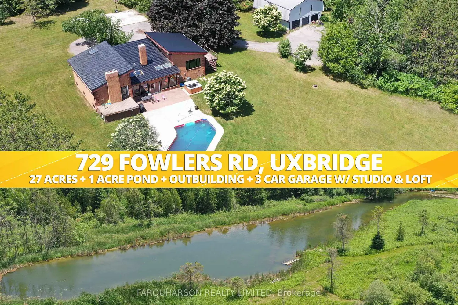 27 ACRES | POND | SHOP | STUDIO | 3-CAR DETACHED GARAGE | POOL & MORE. An exceptional 27-acre country retreat where privacy, versatility, and natural beauty come together. A long, winding private driveway carries you through mature forest, rolling terrain, open meadows, and scenic trails before arriving at a secluded home setting tucked into the southern portion of the property. Designed for both everyday living and entertaining, the outdoor space features a generous patio and private inground pool, ideal for hosting or unwinding in complete seclusion. The three-car detached garage is enhanced by a self-contained studio or office above, complete with a second kitchen, living area, and a 4-piece bath, perfect for guests, extended family, or creative work. Further north, the impressive 3,200 sq. ft. insulated shop with a 2-piece bathroom offers endless possibilities for hobbyists, contractors, or storage needs. A tranquil pond and expansive grounds complete the setting. Located just north of Uxbridge, enjoy peaceful country living with convenient access to town amenities, sports facilities, and hundreds of acres of surrounding regional forest. Recent upgrades include a metal roof with warranty and updated windows throughout much of the home. This is more than a property. It's a lifestyle opportunity.