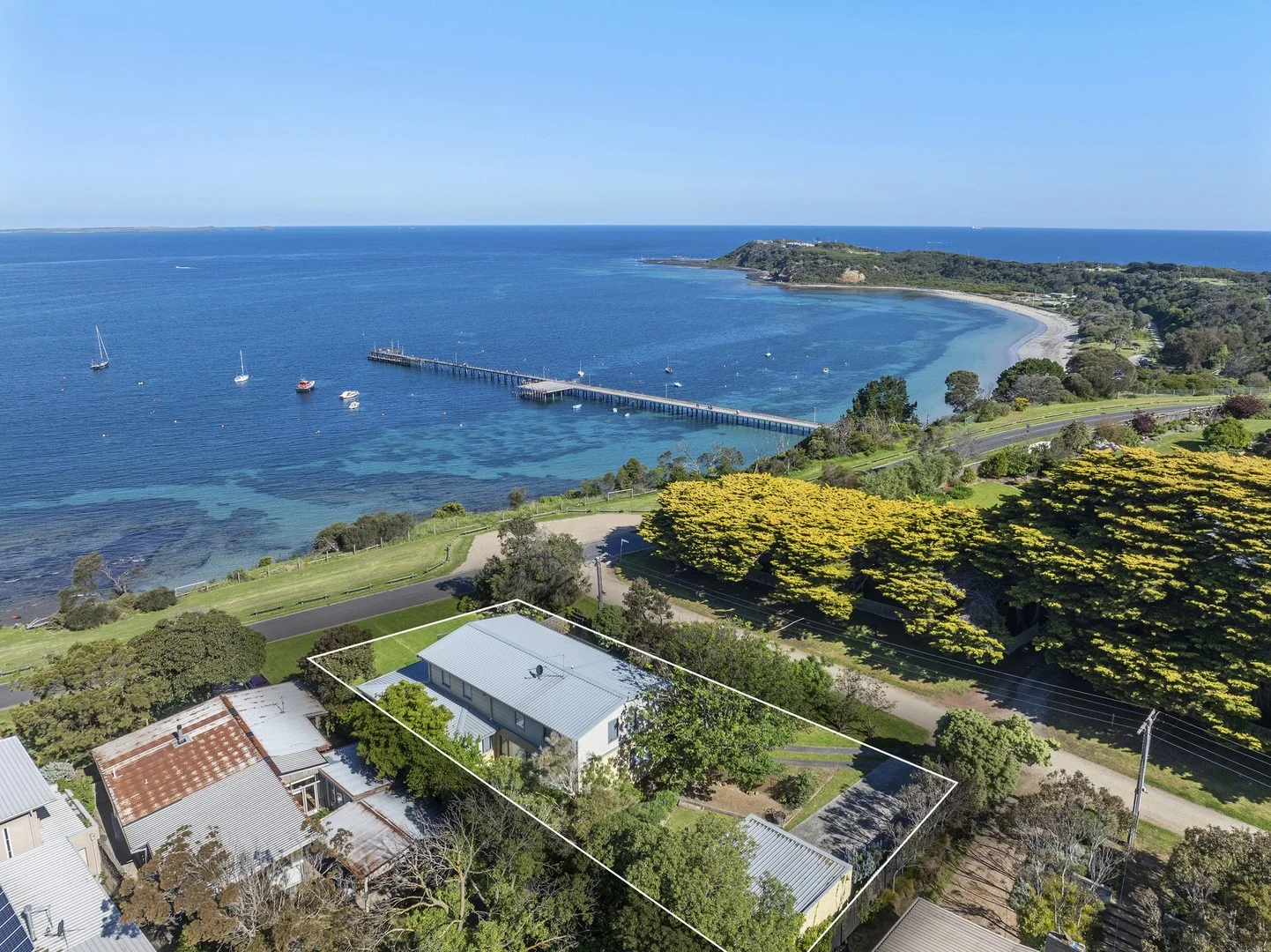 Description: Superbly elevated directly above the iconic Flinders Pier on a 765 sqm approx. corner allotment, this impressive family residence in one of Flinders' most exclusive locations captures the unbeatable and ever changing views across Philip Island, The Nobbies and Seal Rocks and beyond. Spanning two expansive, light filled levels with abundant accommodation for family and friends, the immaculate residence's sleek and stylish interior flows to al fresco entertaining decks on each level, revealing the full magnitude of the mesmerising ocean panorama. The ground level introduces an open plan family domain, with a sparkling kitchen overlooking a dining and living zone beside an ambient gas log fire. Also on this level are three spacious, robed bedrooms including a master with ensuite and a family bathroom. Upstairs offers an additional living room and handy kitchenette, expanding onto a wrap-around entertaining deck immersed in the scenic surrounds. A further three robed bedrooms, family bathroom and study/ 7th bedroom facilitates effortless hosting of extended family and friends and an opportunity to share the idyllic indulgence of the remarkable location. Comfortable and inviting all year round with ducted heating, split system heating and cooling and nature's own ocean breezes, the remarkable property is just moments from Flinders Village, The Flinders Hotel, Flinders Golf Club, stunning beaches and renowned surf breaks. An exceptional weekender or permanent residence as is, its wide corner allotment also opens up renovation or rebuild potential (STCA) to further capitalise on its world class, ultimate lifestyle location.