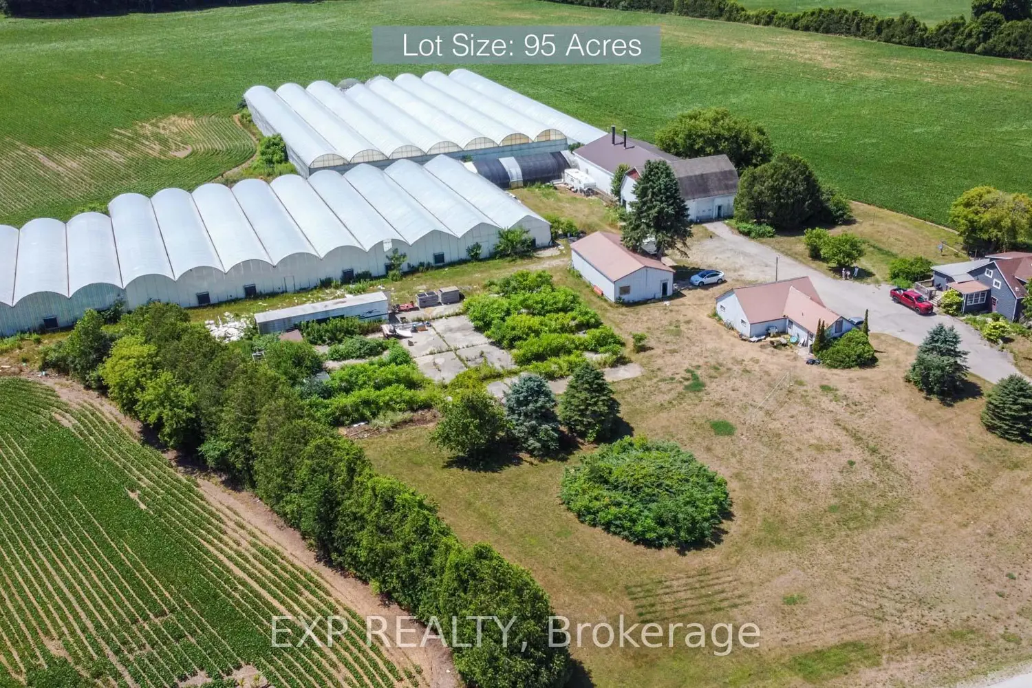 Exceptional agricultural opportunity on 95 acres featuring 75 workable acres, a spacious 5-bedroom detached farmhouse in good condition, and additional accommodations with a bunkhouse for labourers. A service/storage shop building is also included. Greenhouse Facilities: The property boasts a modern 1.75-acre greenhouse operation designed for high-yield production. Equipped with an above-floor, central hot water heating system capable of heating up to 4.5 acres, the greenhouse supports 3-4 crop cycles per year. Blackout system integrated throughout the property. Automated roof venting, controlled by a centralized computer system, allows for precise climate management. The same system can be adjusted to regulate both the hot water heating and ventilation. **Service & Utility Areas** The greenhouse complex includes over 6,000 sq. ft. of functional space for offices, barns, packing and shipping, warehousing, hot water storage, coolers, and boiler room - ideal for efficient operations and future expansion.