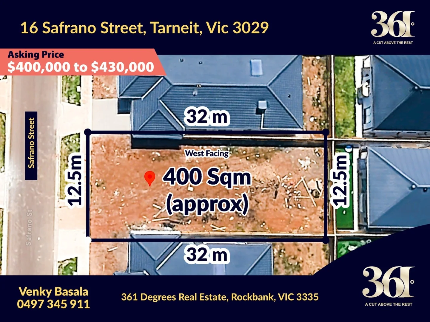 Description: Venky Basala and 361 Degrees Real Estate are excited to present an exceptional opportunity to secure a spacious 400 sqm titled block in the highly sought-after Alamora Estate, Tarneit. This prime location is perfect for those looking to build their dream home in a vibrant community. Key Features Education Nearby Within walking distance to Karwan Primary School and Brinbeal Secondary College, Dianella Community centre and childcare centres making it an ideal spot for families. Recreational Amenities Best of all, you will have access to Club Alamora, Exclusive residents-only leisure and wellbeing hub. Club Alamora will feature a café, swimming pools, state-of-the-art gymnasium, parents' retreat, and a multi-use sports court. Close by sports ovals, parks, and scenic wetlands-perfect for outdoor activities and family gatherings. Shopping and Dining Options A new shopping center is on the horizon, along with established choices like Tarneit West Shopping Centre and Pacific Werribee Shopping Centre for all your retail needs. Convenient Transportation Easy access to Tarneit, upcoming Davis Road station, Hoppers Crossing and Werribee railway stations ensures seamless commuting to Melbourne and beyond. Community Services Close to the Melbourne Grand Mosque and Islamic College of Melbourne, offering valuable community support and resources. Why Choose Alamora Estate? Thriving Community Experience a friendly neighborhood atmosphere with community events and activities. Investment Potential A rapidly developing area with increasing property values-perfect for long-term investment. Family-Friendly Environment Safe and welcoming, making it an excellent choice for families of all sizes. Take the Next Step! Don't miss out on this rare opportunity to invest in a thriving area. Contact Venky Basala today at 0497 345 911 to arrange a viewing and explore your options! DISCLAIMER: All dimensions are approximate. Information provided is for general purposes only and does not constitute any representation from the vendor or agent. For an up-to-date copy of the Due Diligence Check List, please visit: Due Diligence Check List. Read less