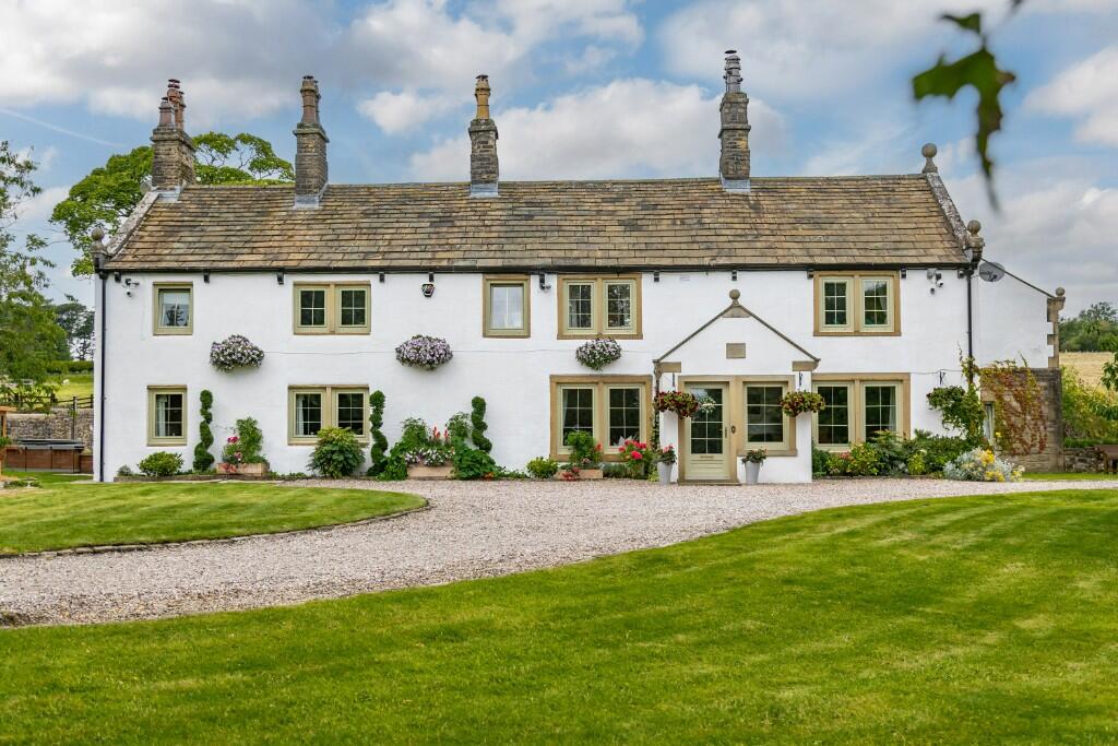 The house offers generously sized living spaces, including four reception rooms, a breakfast kitchen, an expansive conservatory, five bedrooms, and three bathrooms. The spacious principal suite enjoys breathtaking views from every room. The home boasts exquisite period features such as an original stone staircase, timber-trussed ceilings, mullioned windows, and elegant marble fireplaces. Additional amenities include an integral three-car garage, a detached timber garden storage building, and a tennis court. This property offers the tranquillity of a rural setting, with excellent motorway links for easy access.
