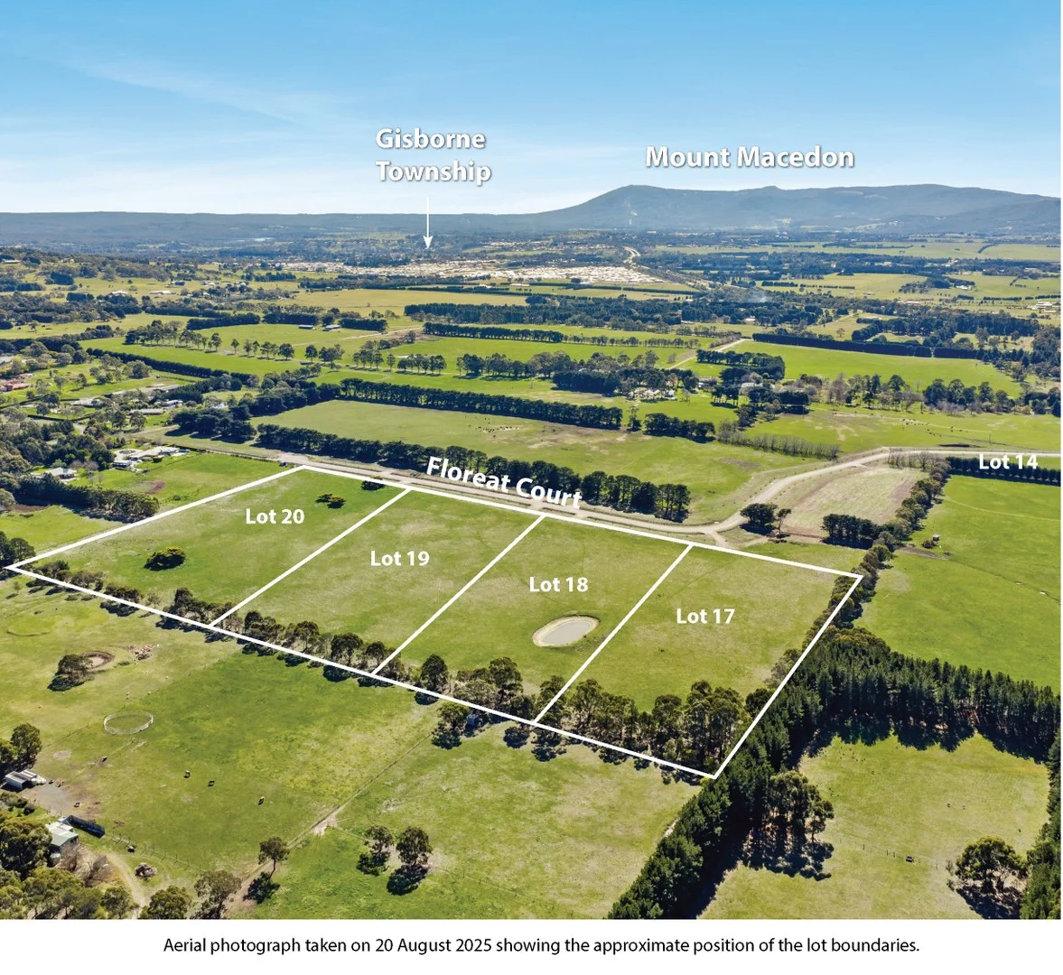 Description: Agent on site: Saturday 20/9/2025 from 3pm to 3:30pm. No's 103, 105, 113 and 123 Floreat Court, Gisborne South (off Cabbage Tree Lane & Couangalt Road) Approximately 32km (30 minutes) from Melbourne Airport 50km (40 minutes) from Melbourne CBD and 8km to the Gisborne Town Centre. Features include: Sealed road frontages with driveway entrances constructed, excellent soils, beautiful views from most lots, underground power supply, NBN and B-class recycled water are all available. Please note: The new titles for each property have been issued by the Office of Titles, so they are ready for you to build your dream home on immediately. Lot 17 (No. 103) 3.03 ha (7.4 acres) $1,245,000 Lot 18 (No. 105) 3.03 ha (7.4 acres) $1,395,000 Lot 19 (No. 113) 3.03 ha (7.4 acres) $1,425,000 Lot 20 (No. 123) 3.03 ha (7.4 acres) $1,475,000