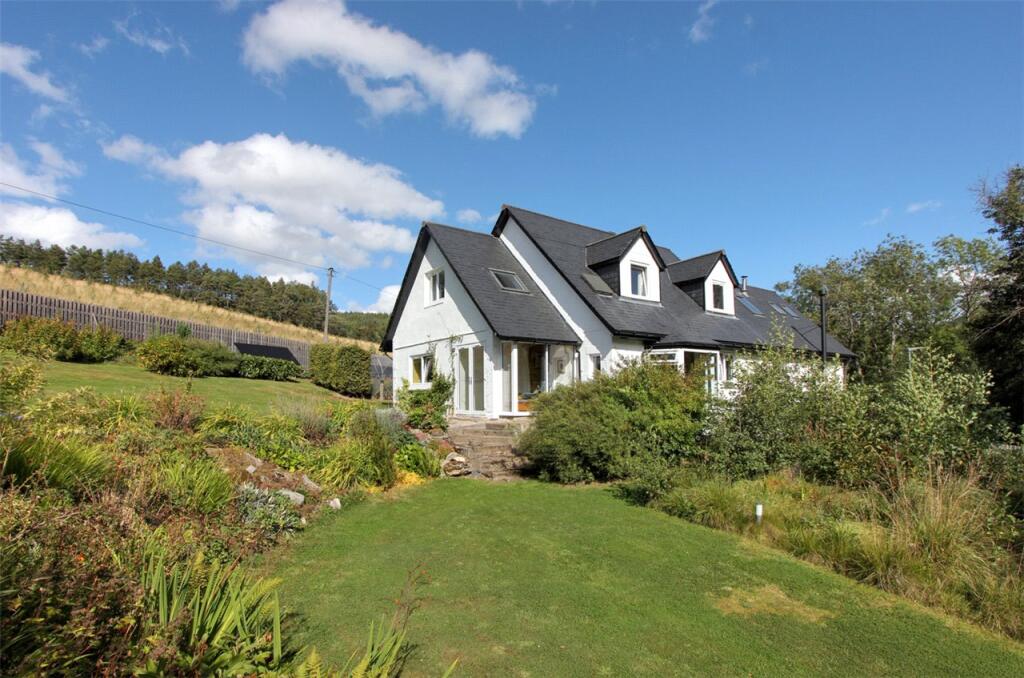 Full Description: Greenwood is an impressive modern house located in an accessible position near Parkmore and just 1.5 miles from the historic and popular Speyside village of Dufftown. Dufftown has good range of day to day amenities including a well-regarded primary school, a village hall for community events, a Church, convenience store, Post Office and various hotels, pubs and coffee shops. With easy access to the Spey, Cairngorms and Moray coastline, the area has a rich and diverse range of services and amenities and is becoming a haven for arts, cultural and social events with many new independent shops in the area.<br /><br />Elgin (about 19 miles) is the principle town in the country and has a wide range of amenities including various major supermarkets, a library, a good selection of independent shops, various sporting and recreational facilities and a train station providing direct links to Aberdeen and Inverness. Aberdeen and Inverness provides all of the facilities expected from modern and prosperous cities, with an excellent selection of shopping, retail parks and associated services, rail links and airports.<br /><br />Originally built as a smaller traditional cottage, Greenwood has been extended and improved in recent years, creating what is now a very appealing and energy efficient family home. Built predominantly from brick and rendered block under a pitched slate roof, the house provides well-appointed and flexible accommodation over three storeys. From the driveway, a door opens to the lower ground floor boot room/gym which leads on to a hallway. To the left is a utility room with a wood pellet central heating boiler, stainless steel sink / worktop and space for various white goods. Back in the hallway, stairs (with a substantial built in store) lead up to the upper ground floor where directly ahead is a door to the garden and to the right is a magnificent kitchen/living room with a double height ceiling and exposed timber ceiling beams. The kitchen has glazed bi-fold doors overlooking the garden, modern wall and floor units and a range of integrated appliances whilst the living area also has a wood burning stove. There is also a large pantry which provides excellent storage space. Opposite the kitchen/living room is a dining area which opens to the hallway and then on to an impressive sitting room and sun room with large windows that flood the room with natural light and French doors out to the garden. There are two good sized bedrooms and a family shower room On the first floor, a landing offers space for an office/sitting area whilst there is also a further bathroom and three bedrooms, all of which are spacious and bright and one of which gives access to a useful storage room. Overall, Greenwood is a light and spacious house with a layout which allows for a great deal of flexibility. It has been modernised to a high standard with high quality kitchen and bathroom fittings. It is double glazed, has a wood pellet central heating system, fifteen 370 watt solar panels, battery, inverter and thermal store. The property has private water and drainage.<br /><br />GARDEN<br />Outside, there is a generously sized garden which is mainly enclosed by a wooden fence and hedge. The garden includes areas of lawn, a gravelled parking area, a mature flower bed, some useful stores and a greenhouse.<br /><br /> EPC Rating = B<br /><br />
