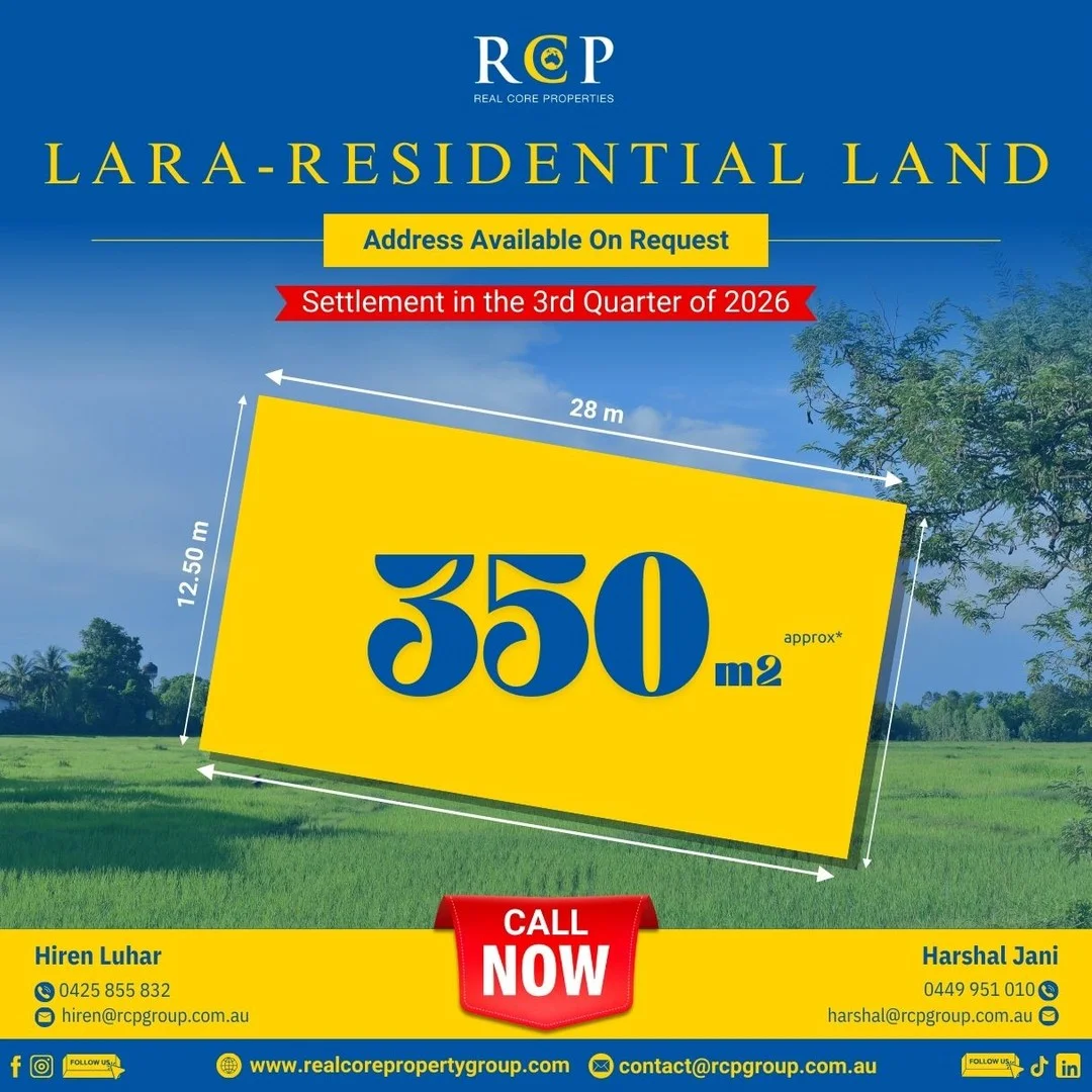 Description: Looking to build your dream home or invest in a growing area? This is your chance to secure a 350sqm parcel of titled land in Lara, perfectly positioned for lifestyle and convenience. • Size: 350 square meters (approx.) • Location: Situated in one of Lara's sought-after residential pockets • Frontage: Ideal dimensions to suit a range of modern home designs Lara offers the perfect blend of semi-rural tranquility and urban accessibility. With fast-growing infrastructure, family-friendly parks, reputable schools, shopping centres, and quick access to the Princes Freeway, Lara is a smart choice for both homeowners and investors. Location Benefits: • 5 mins to Lara Train Station • 10 mins to Avalon Airport • 15 mins to Geelong CBD • 45 mins to Melbourne via freeway Whether you're looking to build your first home, downsize, or add to your property portfolio, this block is a fantastic opportunity. Don't miss out! Land in Lara is in high demand - secure your block today. For further information, please contact Hiren Luhar on 0425 855 832 or Harshal Jani 0499 951 010. Please see the below link for an up-to-date copy of the Due Diligence Check List: http://www.consumer.vic.gov.au/duediligencechecklist DISCLAIMER: All stated dimensions and inclusion are approximate and only subject to vendor's approval. Particulars given are for general information only and do not constitute any representation on the part of the vendor or agent.