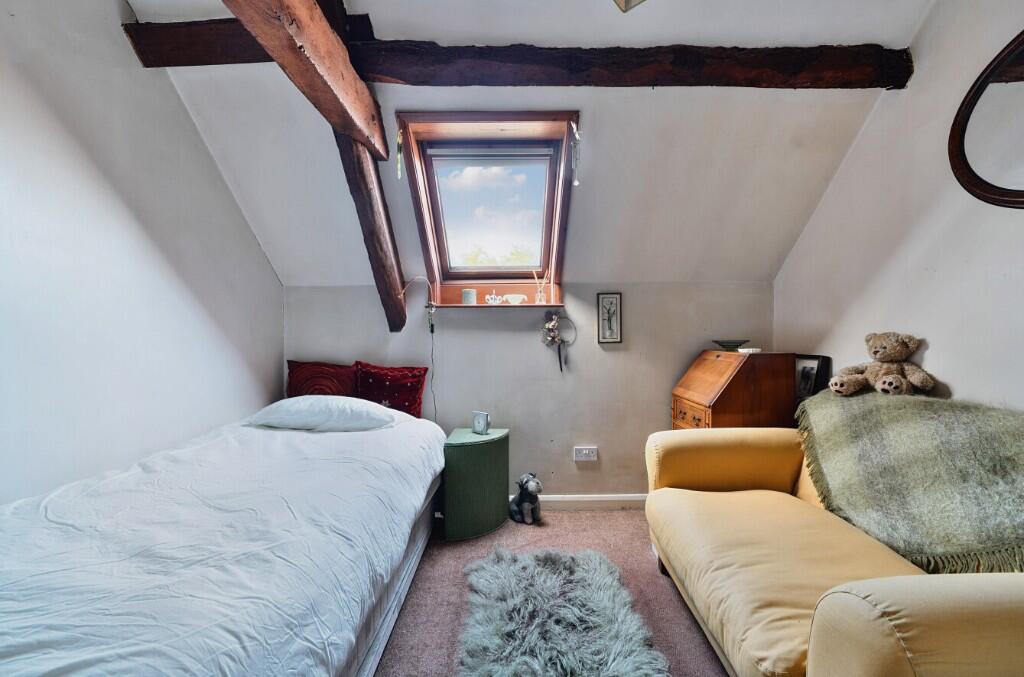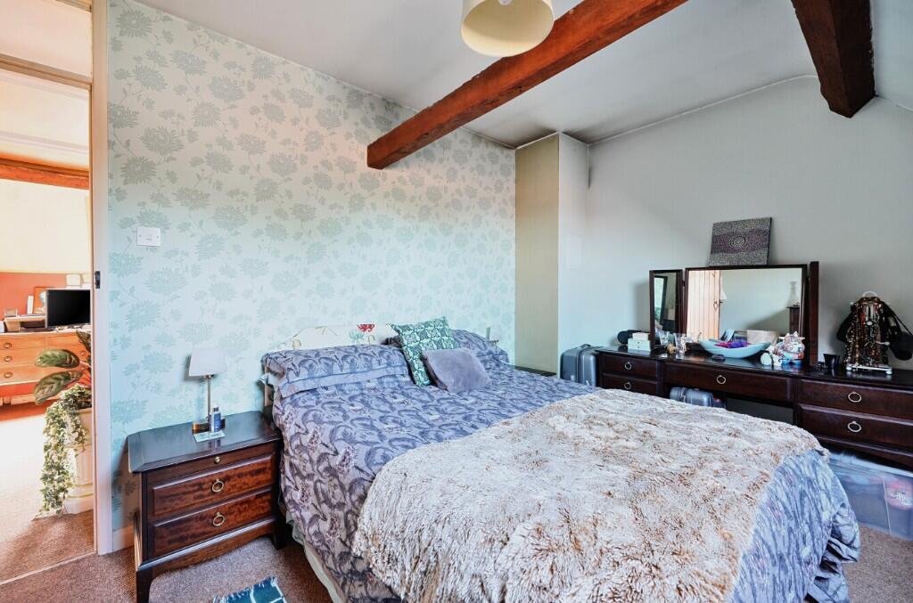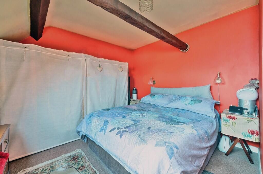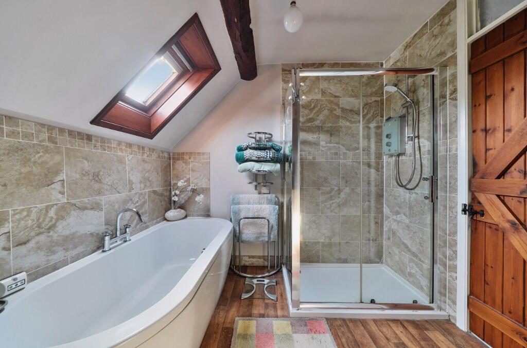 On the first floor there is an airing cupboard and loft access. The first bedroom has a Velux window and exposed beams, the second bedroom has a Velux window an exposed beams and electric panel heater, the final bedroom has a Velux window and exposed beams and electric panel radiator. All the first-floor doors are 'latch and brace'. The bathroom is also a good size with a Velux window to the front, WC, wash hand basin, bath with chrome mixer and double walk-in shower with electric shower being fully tiled. Exposed beam and vinyl flooring.