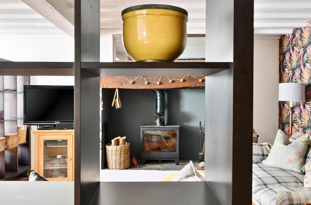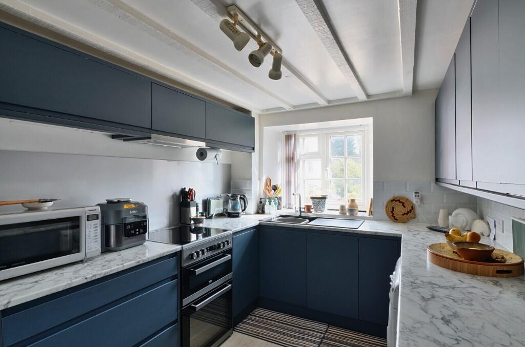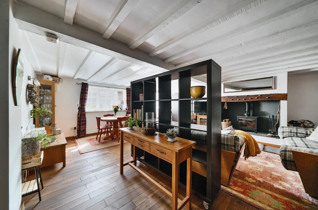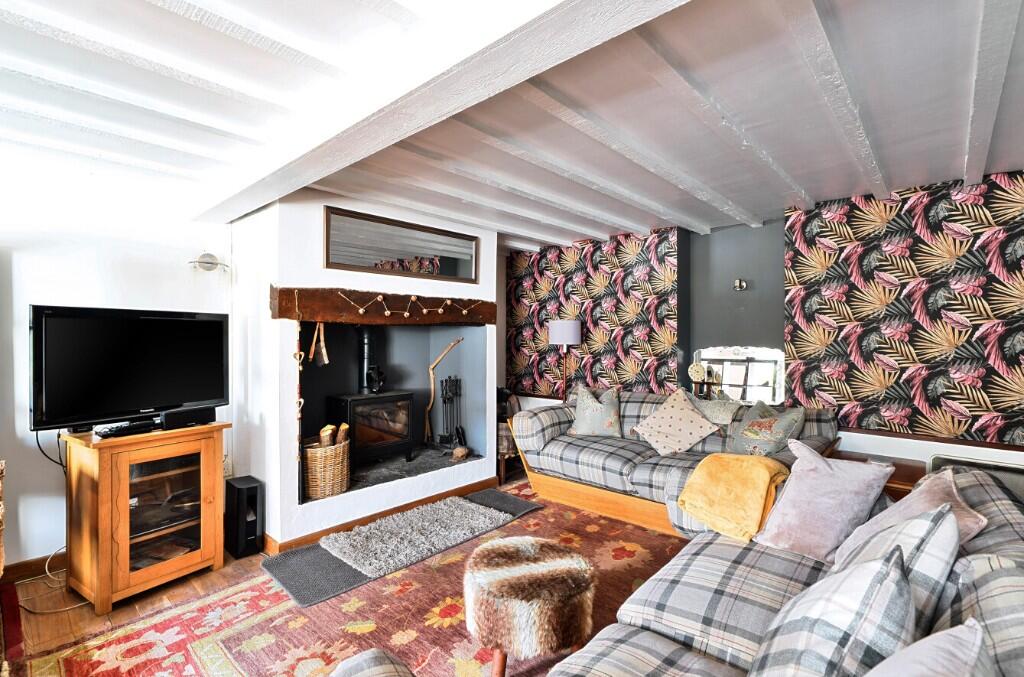 The property is accessed via a private courtyard through a uPVC stable door into the generous sitting room with oak flooring and painted beams. The main feature being the inglenook fireplace with inset wood burner (perfect for those cosy night in!) and wooden mantle, three 'hidden' cupboards along one wall offer ample a discreet storage, wall lights and a double-glazed window to the front. Ample room for a dining table and chairs and understairs storage space.