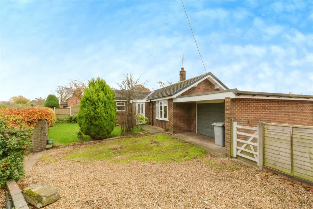 A UNIQUELY DESIGNED BUNGALOW IN AN IDYLLIC LOCATION WITH VIEWS OVER FIELDS TO THE REAR, GARDENS TO THREE SIDES., DUAL ASPECT LIVING ROOM, KITCHEN LEADING TO CONSERVATORY, THREE WELL PROPORTIONED BEDROOMS, BATHROOM, UPVC DOUBLE GLAZING, NEWLY INSTALLED UPVC SOFFITS & FACIAS AND GAS CENTRAL HEATING, DRIVEWAY PARKING LEADING TO GARAGE, MUST BE VIEWED, NO ONWARD CHAIN
