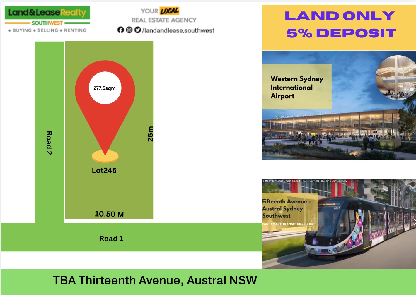 Description: Land release in Austral !! Landonly for sale !!! Only 5% deposit now and rest in mid 2025 Potential for first home buyers or investor First come !!first serve !! Thinking of location?? Between fourteenth and fifteenth avenue austral Thinking of what's future like there Check it out online here https://www.liverpool.nsw.gov.au/development/major-projects/fifteenth-avenue-smart-transit-fast-corridor#.YZXCWfNYJ5s.messenger Don't be late before sold them out !! Location : • 1 min drive to Austral Town Centre (IGA, Medical Centre, etc) • 2 mins drive to Austral Public School • 7 Mins drive to Leppington Station. • 14 Mins Drive to Lakeside Golf Club Camden • 14 mins drive to Westfield Liverpool • 16 mins drive to Western Sydney Airport Austral and Leppington Planning https://www.planning.nsw.gov.au/-/media/Files/DPE/Reports/austral-leppington-planning-report-2012-12.pdf